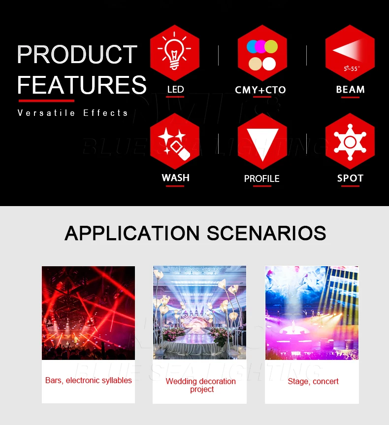 Blue Sea Lighting is an enterprise with rich experience in the integration of industry and trade in stage lighting and stage special effects related equipment. Its products include moving head lights, par lights, wall washer lights, logo gobo projector lights, power distributor, stage effects such as electronic fireworks machines, snow machines, smoke bubble machines, and related accessories such as light clamps.