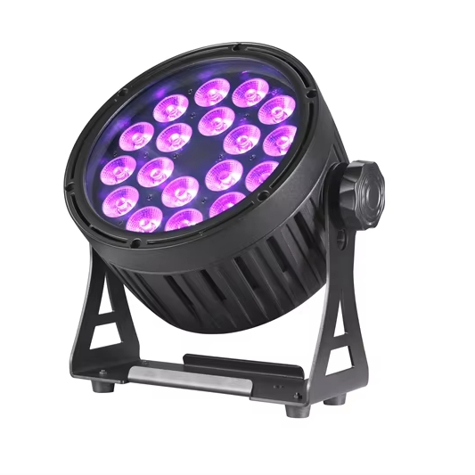 Modern LED PARs solve these issues. The 18x18W RGBWA+UV LED Par Light offers full-color mixing with red, green, blue, white, amber, and ultraviolet diodes, delivering saturated color washes and subtle fades with high efficiency. These fixtures eliminate the need for separate colored gels, reduce fixture count, and enable more control through DMX or onboard programming.