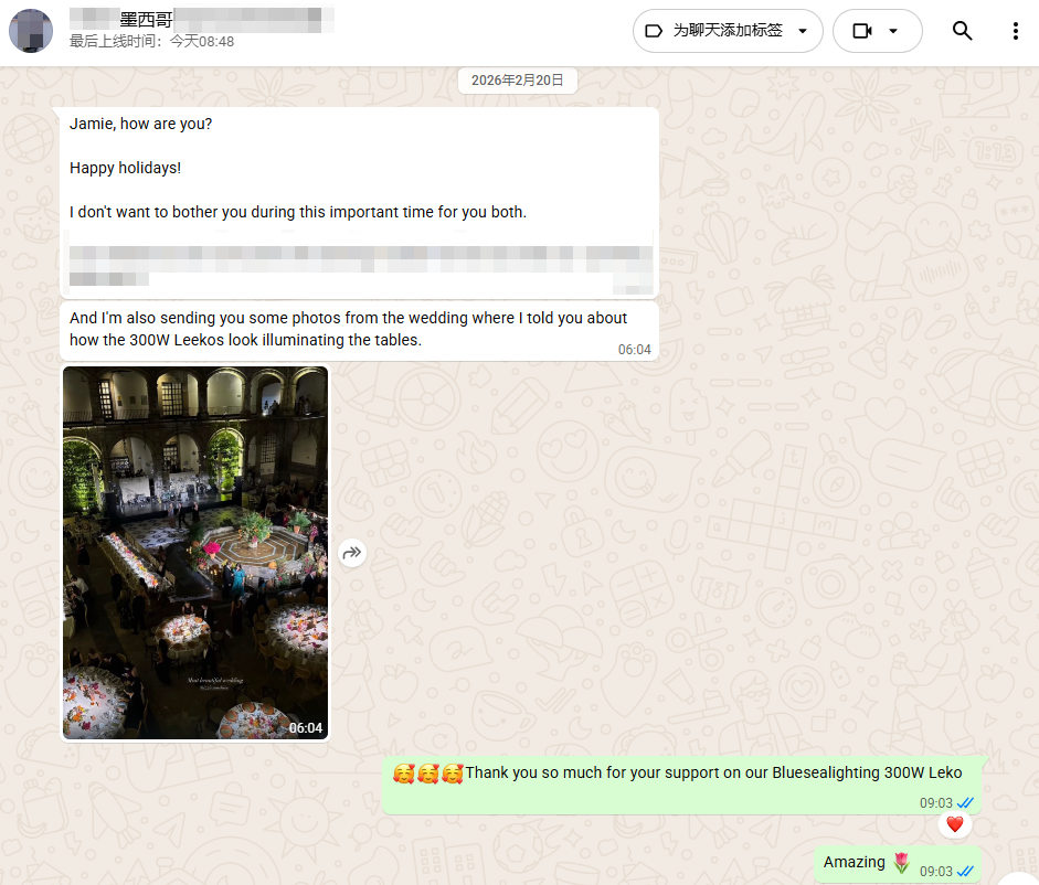 Recently, a customer from Mexico shared positive feedback after using the IP65 300W LED Warm White Zoom Ellipsoidal Profile Spotlight during a large wedding reception. The lighting designer sent photos and messages showing how the 300W Leko fixtures beautifully illuminated the banquet tables.