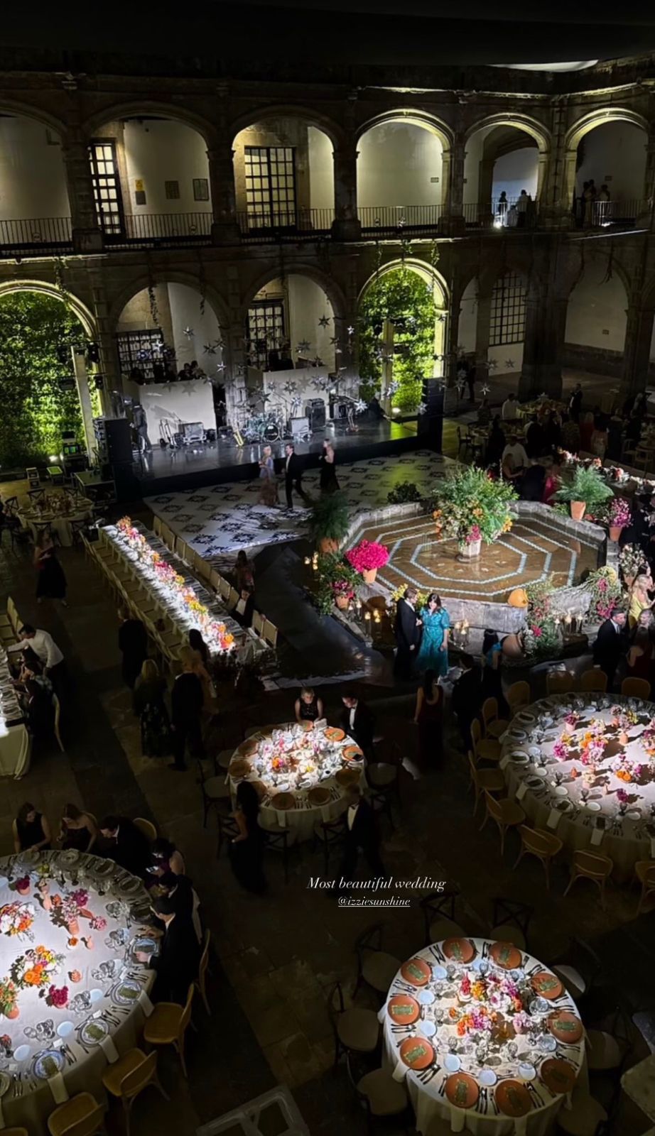 The wedding venue in Mexico featured a spacious courtyard with historic architecture, decorative arches, and a central fountain surrounded by banquet tables.